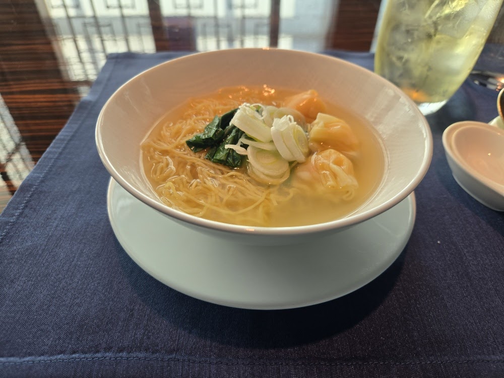 〆の麺料理です。 正直に言います。スープと麺だけを見れば、**「街の有名なラーメン店の方が美味しい」と感じてしまいました。上品すぎるのかもしれません。 ただし、トッピングの「海老ワンタン」**は別格。点心同様、海老のクオリティは凄まじいです。
