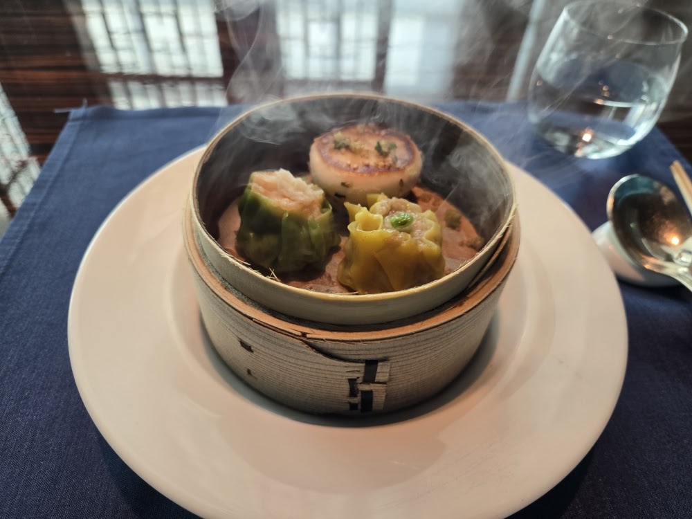 運ばれてきた瞬間、湯気とともに良い香りが。 内容は、豚肉、ほうれん草を練り込んだ鶏肉、そして海老の3種類。