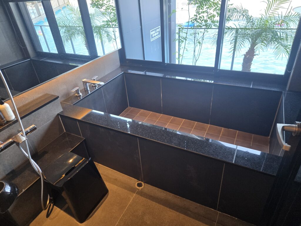 部屋の中にもお風呂があります。こちらからは温泉が出ます。家族で入っても十分広いと思います。
