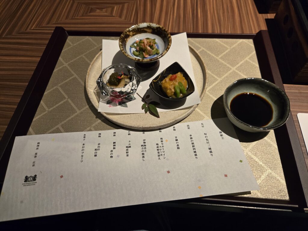 建物自体はモダンで洋風なリゾート建築ですが、提供されるのは本格的な「和」の懐石料理。「雰囲気と料理のジャンルが合っていないのでは?」という意見もあるようですが、個人的には**「リゾートの雰囲気の中で、箸で食べる繊細な和食」**という組み合わせは新鮮で、味も非常に満足度の高いものでした。