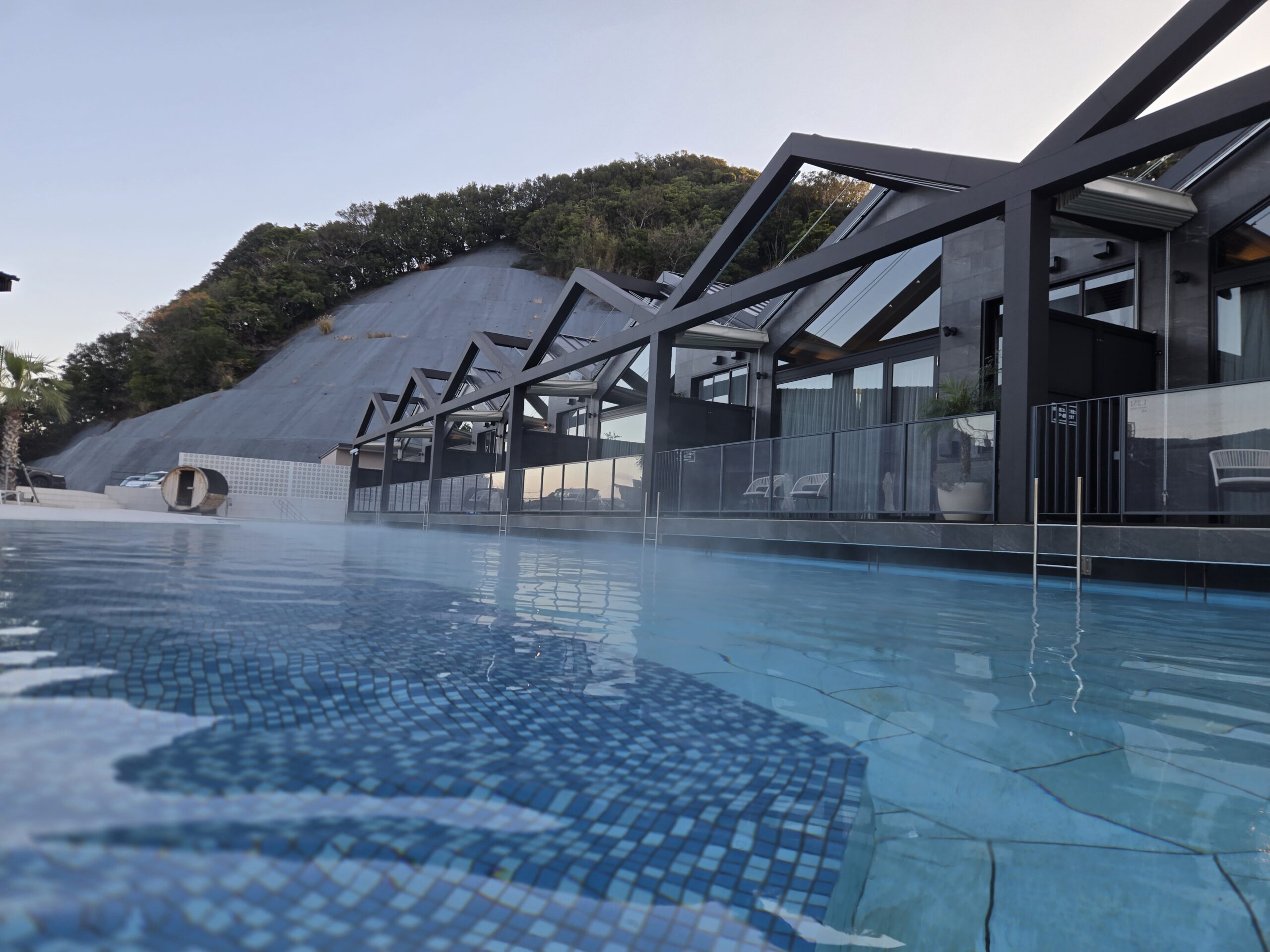 部屋はプールに直結です。このプールは白浜温泉で、年中温水なので冬でも泳げます。上に見える山はコンクリートで固められており、夜に乗るとレーザーマッピングが施されます。