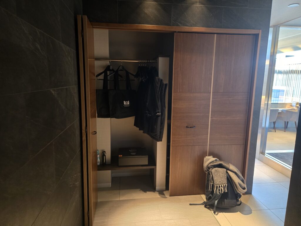 エントランスは広々とした収納で、金庫もあります。画像に見えているバッグにはバスタオルが入っており、このバッグごとプレゼントしてもらいました(すごい・・・)