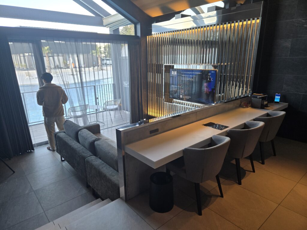エントランスに到着すると、スタッフの方が温かく出迎えてくれます。 ウェルカムドリンクをいただきながら、ゆったりとチェックイン手続き。